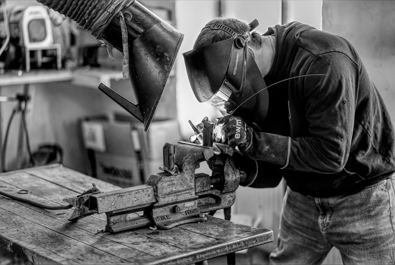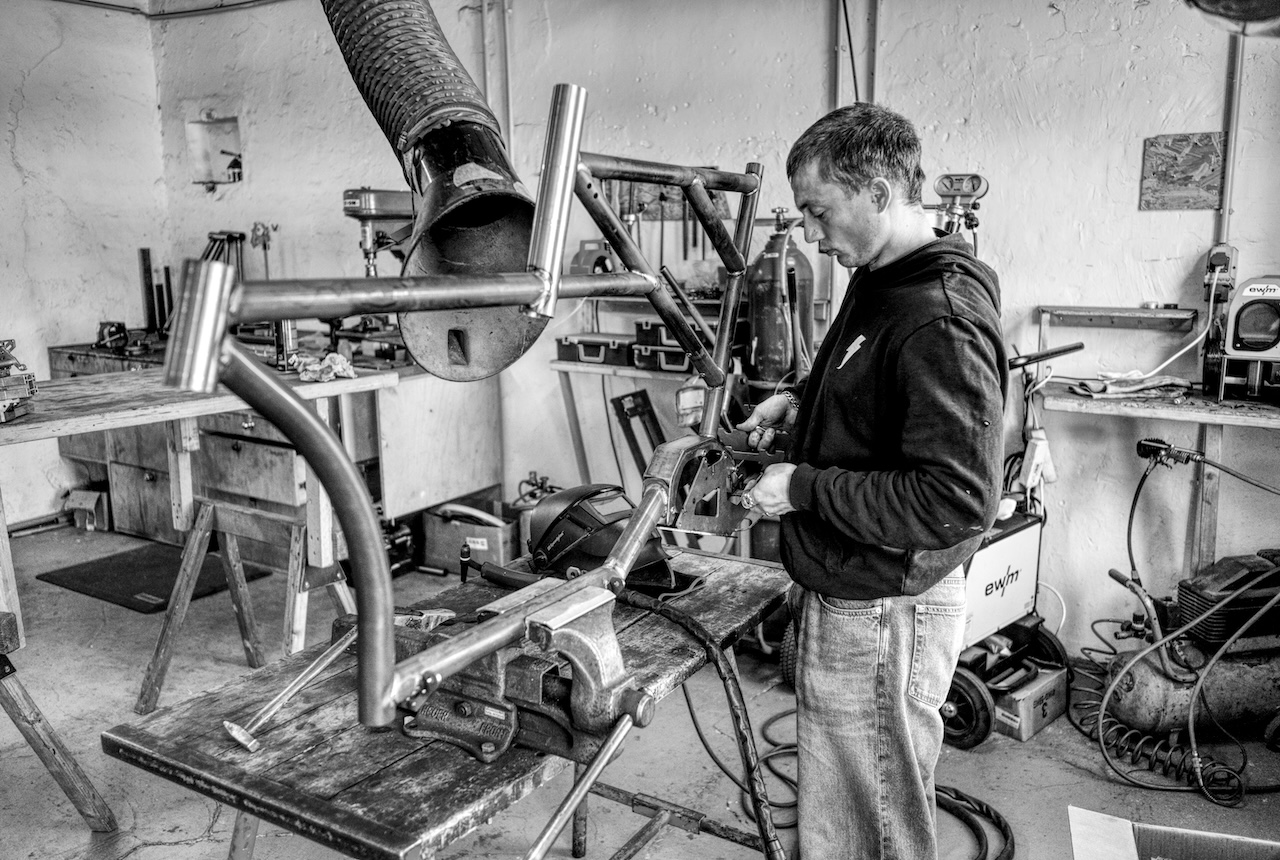 Nils wird gleich einen Rahmen aus der eigens gefertigten Lehre holen, nachdem er den Vorbau geschweisst hat. Auch das geschieht akribisch von Hand- in aller Zeitund Ruhe, die es braucht, damit der Rahmen nicht bricht- wie gerade bei einem großen Hersteller fast serienmäßig passiert.