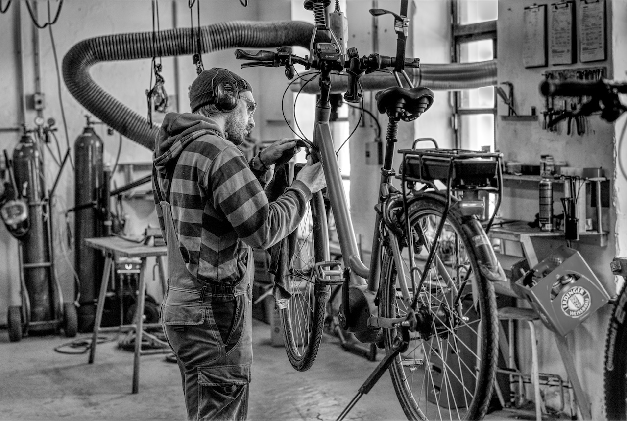 Unscheinbar das notwendig digitale für die modernen E-Bikes, sicht- und fühlbar dagegen all das, worum es wirklich geht. Fremdfabrikate werden hier genauso gewatet und repariert wie die eigenen. Mit der Kompetenz von Machern, die um das Konstruktive, um das Material nicht besser Bescheid wissen können.